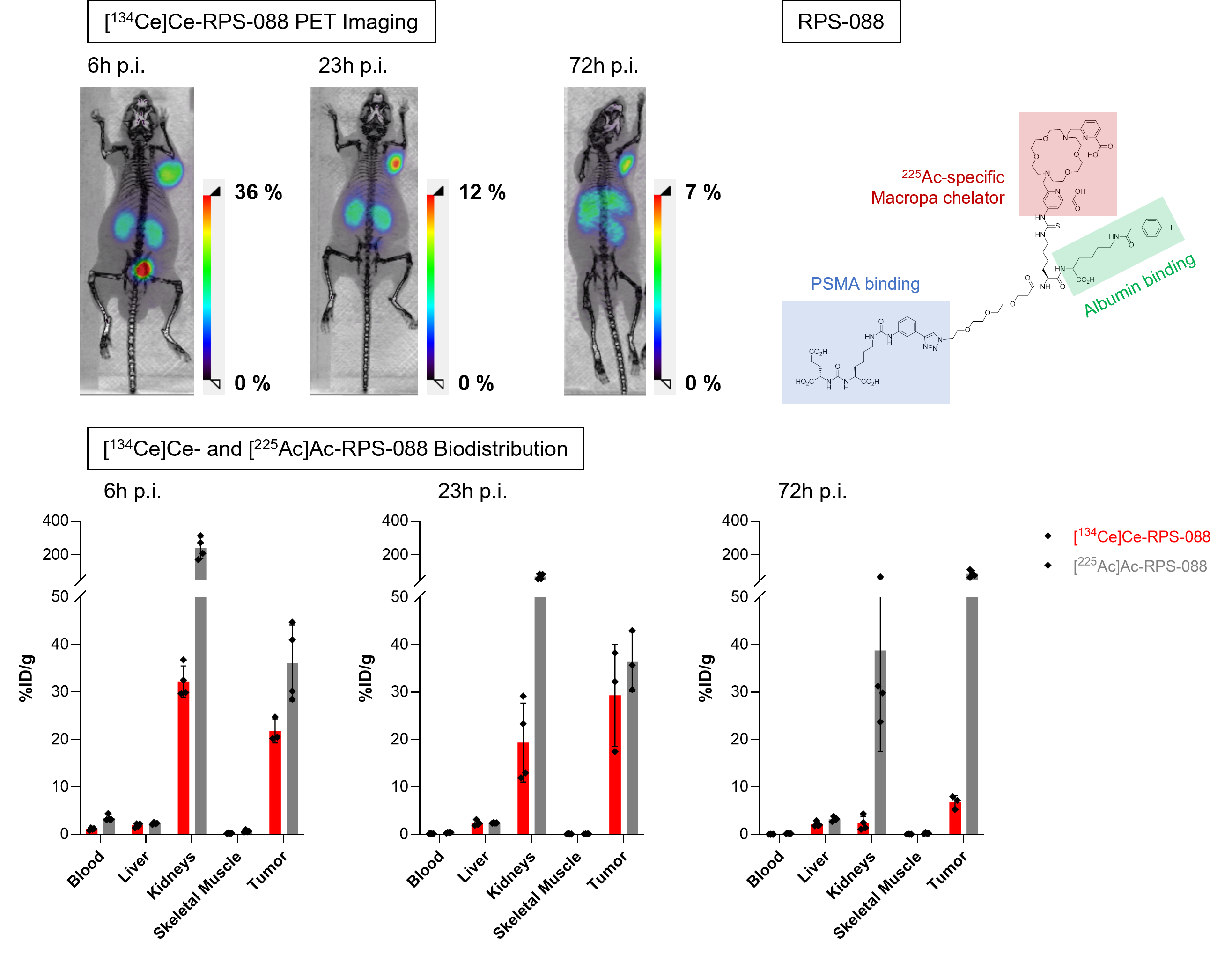 Methods: RPS-088d was labeled with Ce-134 or Ac-225 in 20min in 0.1M NaOAc, pH 6 at 95 °C. Comparative biodistribution studies (n=4) of 3.1-3.7 MBq [134Ce]Ce-RPS-088 (1.6-2.5 MBq/nmol) and 50 kBq [225Ac]Ac-RPS-088 (0.17-0.32 MBq/nmol) were carried out in LNCaP xenograft mice (n=4) 6h, 23h, and 72h post-injection (p.i.). Prior to euthanasia, 30 min static PET images were acquired. Two additional mice were co-administered 1.6 MBq [134Ce]Ce-RPS-088 and 50 kBq [225Ac]Ac-RPS-088. Tumors, kidneys, livers, and spleens were excised 6h p.i. and sectioned for analysis by digital autoradiography. Four non-tumor bearing nude mice were imaged 2h pre- and post-euthanasia. HPLC-based radiometabolite analysis (n=3) of blood, kidney, and liver homogenates from nude mice was carried out following administration of 3.3 MBq [134Ce]Ce-RPS-088 or 150 kBq [225Ac]Ac-RPS-088. In vitro internalization ratios of 10 nM [134Ce]Ce- or [225Ac]Ac-RPS-088 were studied in LNCaP cells after 2h, 6h and 22h of incubation. Finally, the release of Ce-134 and Ac-225 from [134Ce]Ce- and [225Ac]Ac-RPS-088 incubated in human serum at 37 °C was monitored by radio-TLC (50 mM citrate, pH 5.0) for up to 72h.