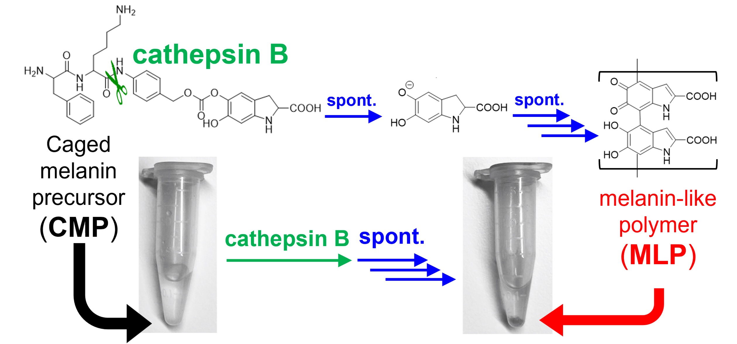 Before incubation with an enzyme, CAMELANIN is stable as a small molecule in water that does not absorb light. After incubation with 1 unit of cathepsin B protease enzyme for 10 minutes, an insoluble, black pellet accumulates in the bottom of the tube, showing that an insoluble melanin-like polymer has been generated. This change from a transparent sample to a sample with a black pellet is evidence for the detection of enzyme activity.