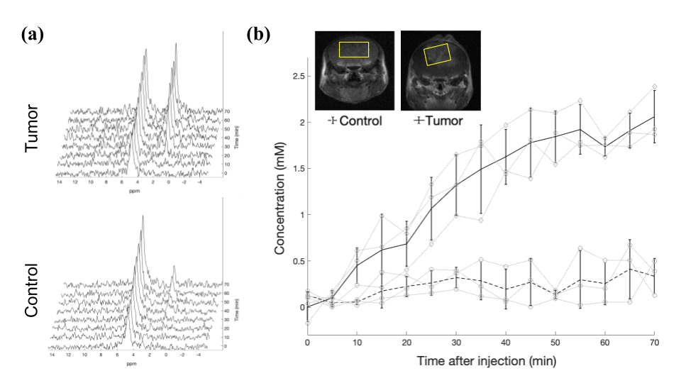 In vivo detection of enhanced leucine uptake in glioma: Animal preparation: Tumor-bearing mice (n=3) were prepared by stereotactically injecting 50k GL261 cells into the dorsal striatum. Tumor-bearing and control (n=3) mice were injected with 500 µL of 100 mM d10-leucine solution subcutaneously (Total dose = 35.3 mg/100 g). Time course 2H MRS: 2H SPECIAL spectra were collected in 5-minute increments up to 70 mins (TR/TE = 450/4.27 ms).