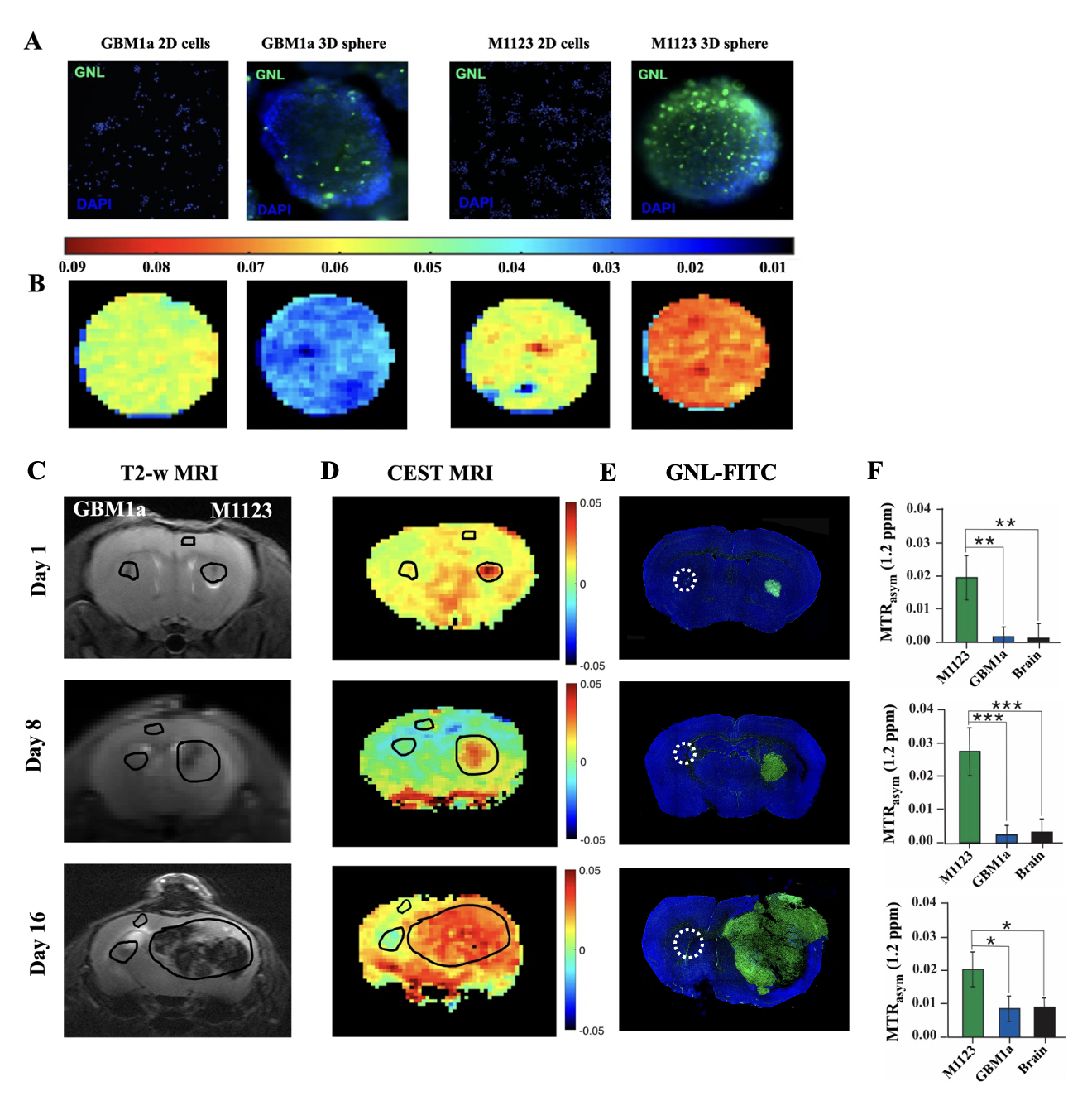 Figure 1. (A) In vitro mannose N-linked glycan expression (green) of GBM1a and M1123 2D cell and 3D tumor sphere cultures. (B) MANw CEST MR images of 2D cell and 3D tumor sphere phantoms. Color bar in (B) represents data acquired at 1.2 ppm. (C) T2-weighted MRI and (D) MANw CEST MRI of GBM1a (left) and M1123 (right) tumor spheres xenografted in immunodeficient NSG mice obtained at 1, 8 and 16 days post implantation. Color bar in (B) represents data acquired at 1.2 ppm. (E) Correlating GNL-FITC staining for negative GBM1a (left, circles) and positive M1123 (right) implanted tumor spheres shown in panels (C,D). (F) Summary of MTRasym values at 1.2 ppm obtained at day 1, 8 and 16. All data are presented as mean±SD, n=3. P-values <0.001 (***), 0.001-0.01 (**) and 0.01-0.05 (*) were considered statistically significant.