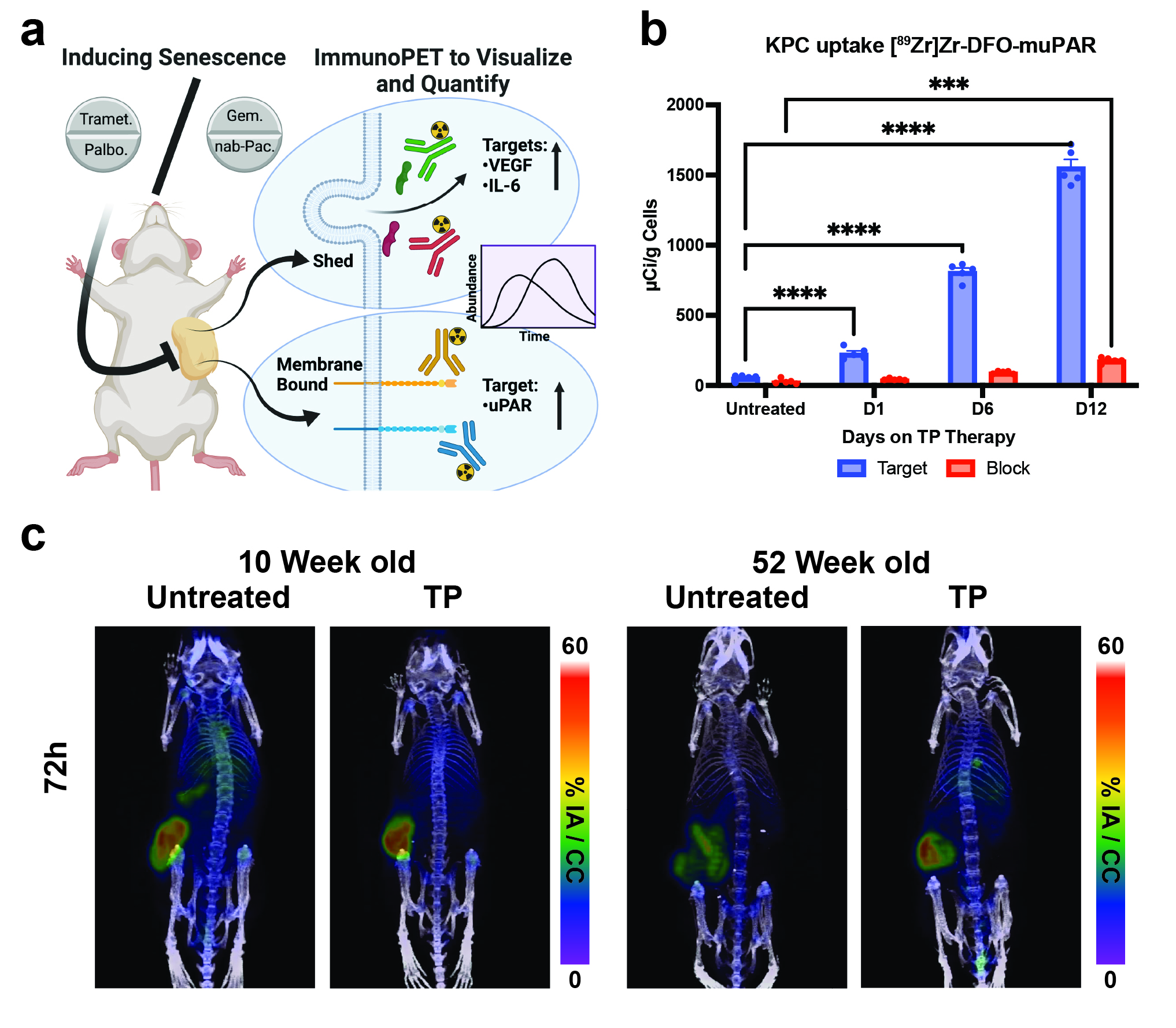 A) A senescent state in pancreatic cancer can be initiated with a combination of trametinib and palbociclib, releasing myriad antigens of which uPAR is a membrane bound antigen of interest. B) DFO conjugated and radiolabeled murine specific uPAR antibody ([89Zr]Zr-DFO-muPAR) was shown in vitro to increase nearly 20-fold over 12 days of TP induction, normalized to cell count. C) Further examination of [89Zr]Zr-DFO-muPAR uptake in models of young and aged female c57bl6J mice on TP or treatment naïve show KPC tumors grew faster in aged mice and a lower [89Zr]Zr-DFO-muPAR uptake was observed as a result, yet in aged and TP treated mice, KPC tumors were more like tumors in 10-week old mice.