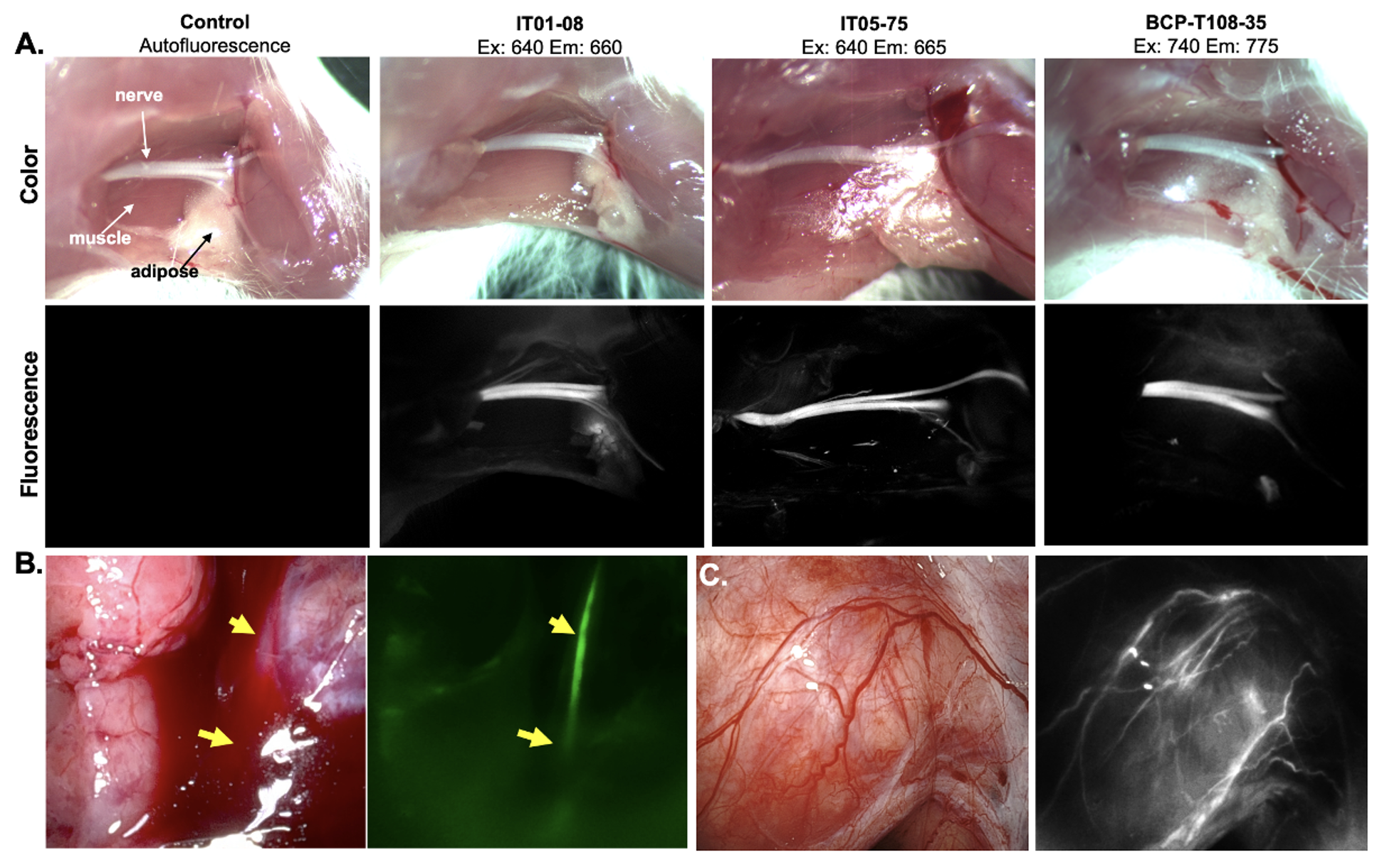 First-in-class nerve-specific fluorophores provide high nerve tissue contrast. A. IT01-08 and IT05-75 as well as the first NIR nerve-specific fluorophore, BCP-T108-35, showed high nerve specificity. B. BCP-T108-35 showed nerve specificity in the swine iliac nerve visualized using the da Vinci Firefly (left = color, right = green false colored fluorescence). Yellow arrows = nerve. C. Administration of BCP-T108-35 enabled.