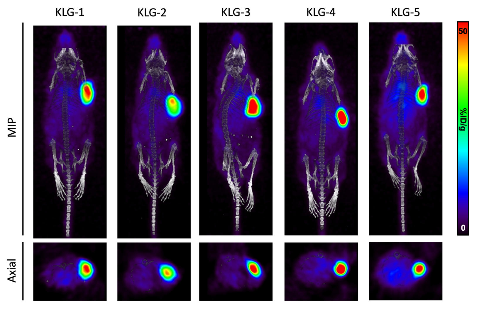 Figure 1. Representative MIP and axial PET/CT images of nude mice bearing U-87 MG xenografts injected with 20 mg (3.7 MBq) of 89Zr-labeled IL13Ra2 antibodies. Imaging conducted six days post radiotracer injection.